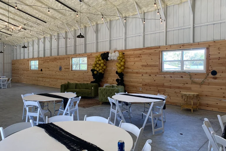 Dave from Deland Florida was interested in a multi-purpose Commercial Metal building to allow him and his wife to harvest honey and provide entertainment space for weddings. They customized a lot of interior features including the backwall paneling, glass garage doors, spray foam insulation and repurposed walk doors.
