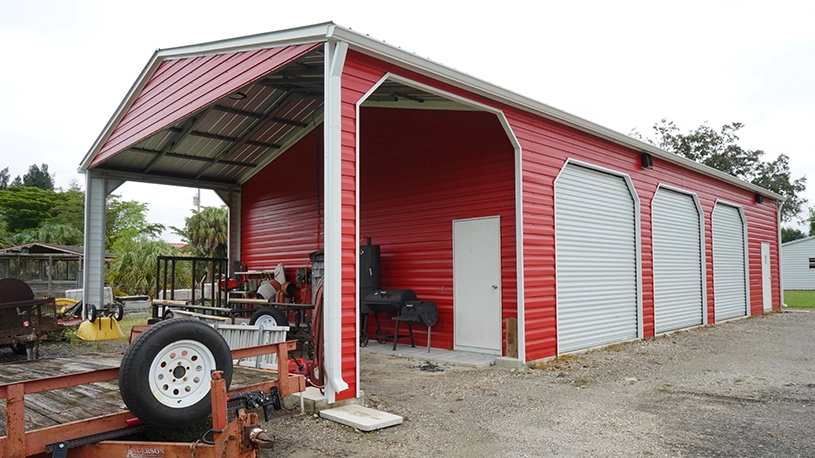 Our 30×60 Garage Carport Hybrid accommodates enough space for a workshop, multiple vehicles and an industrial car lift! This three car garage has three 10′ x 10′ hurricane rated garage doors with dutch corners and 3 service doors. The carport overhang has gable only sheeting with 2 frame outs with dutch corners. Engineered for Naples Florida, Eversafe garage buildings is the safe and affordable building solution for staying on budget. All of our Naples metal building prices include free delivery and installation with crews based in Florida that are insured and licensed with the state. Permitting services are available in Naples Florida. Start with a steel building company you can trust with local offices located in West Palm Beach!