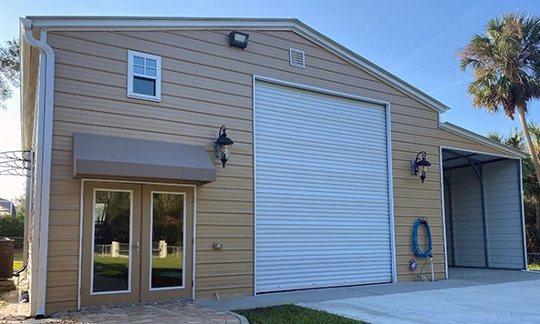 Eversafe’s standard Florida 18×20 one car metal garage comes with a boxed eave roof, one 10’x8’ roll up door and one 36”x80” walk-in door.